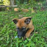 A Belgian Malinois puppy’s coat is short, red, gray, or fawn-colored with a black mask and black tips on the hair. A Belgian Malinois puppy will have large, inquisitive, dark eyes and a slightly bushy tail.